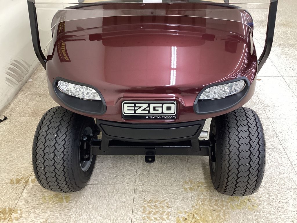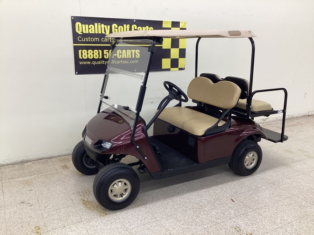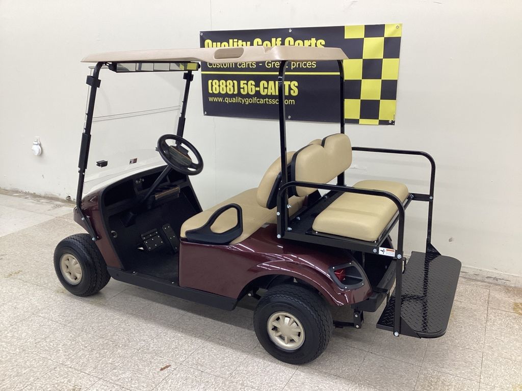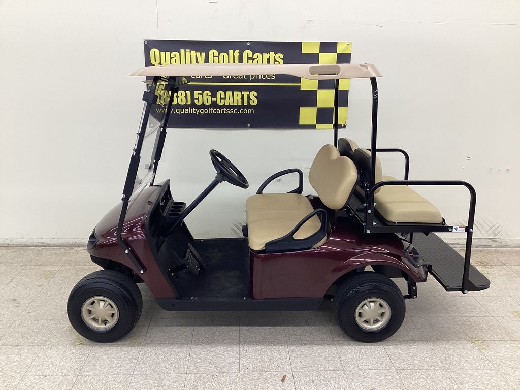 18 Months Warranty on Batteries – 6 Months Warranty on Cart – Burgundy Body w/Short Stone Top – Stone Seats w/Fold Down Rear Seat Kit – Fold Down Windshield – LED Headlights / Tail Lights – 5 Panel Mirror – Stock EZ GO Wheels & Tires