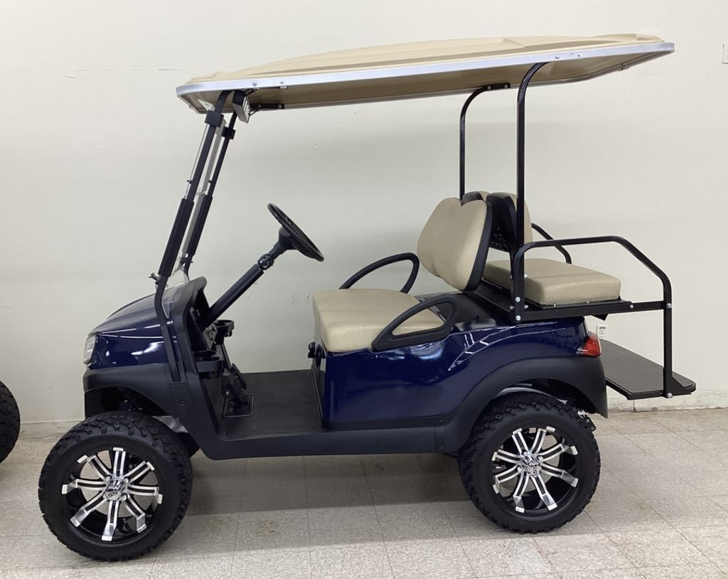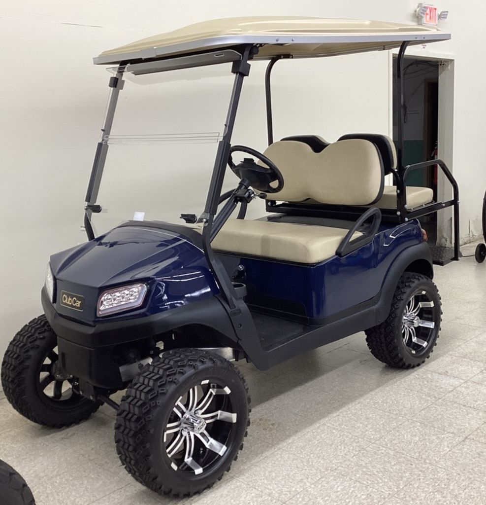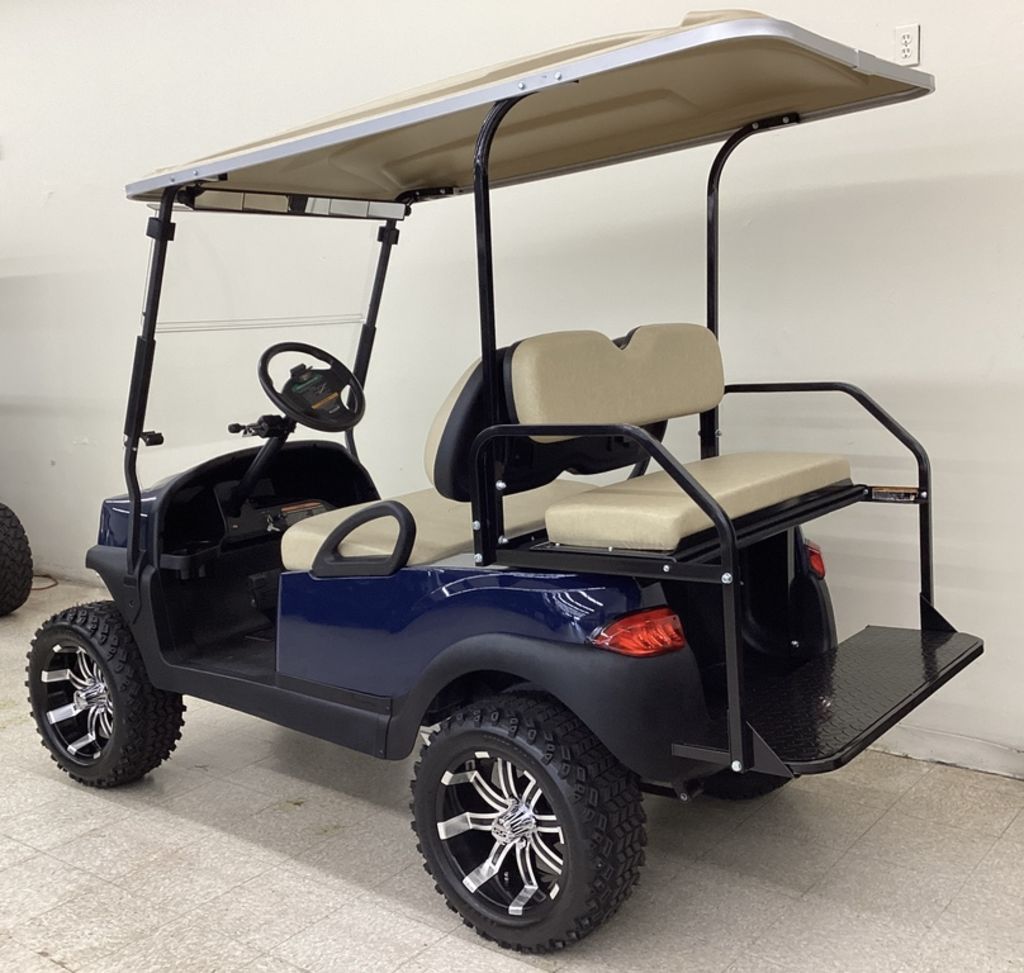 6 Months Warranty on Cart – Navy Blue Painted Body w/ Long Stone Top – Stone Seats w/ fold down rear seat kit – NEW Lift Kit w/ 14″ Sport Wheels & Tires – NEW Fold down windshield – NEW Rear View Mirror – Fuel Injection – Serviced – Ready To Go!