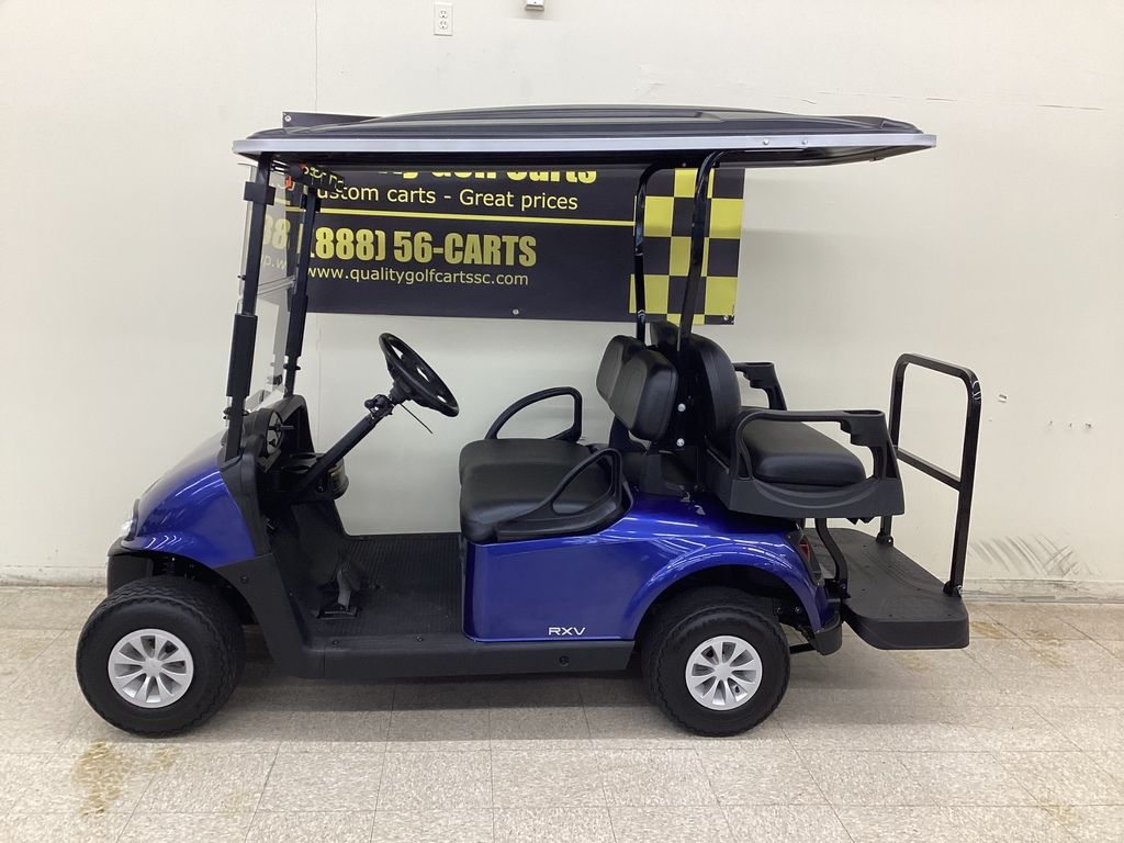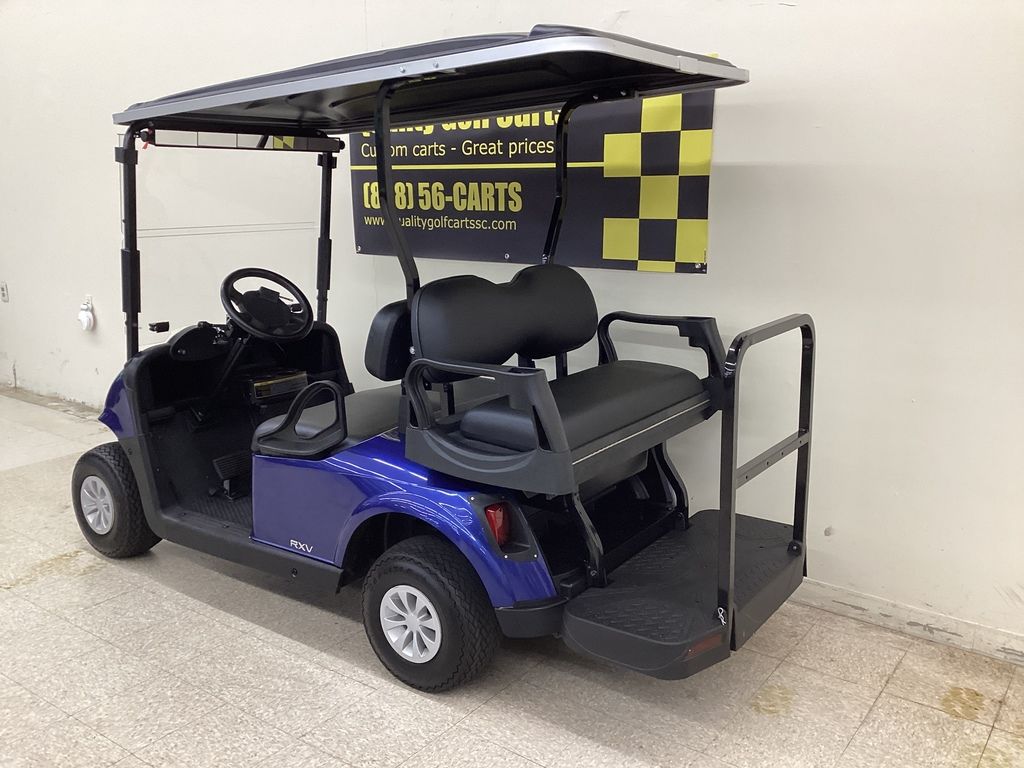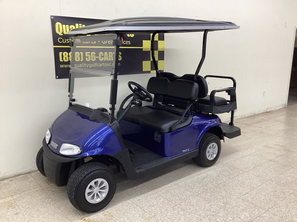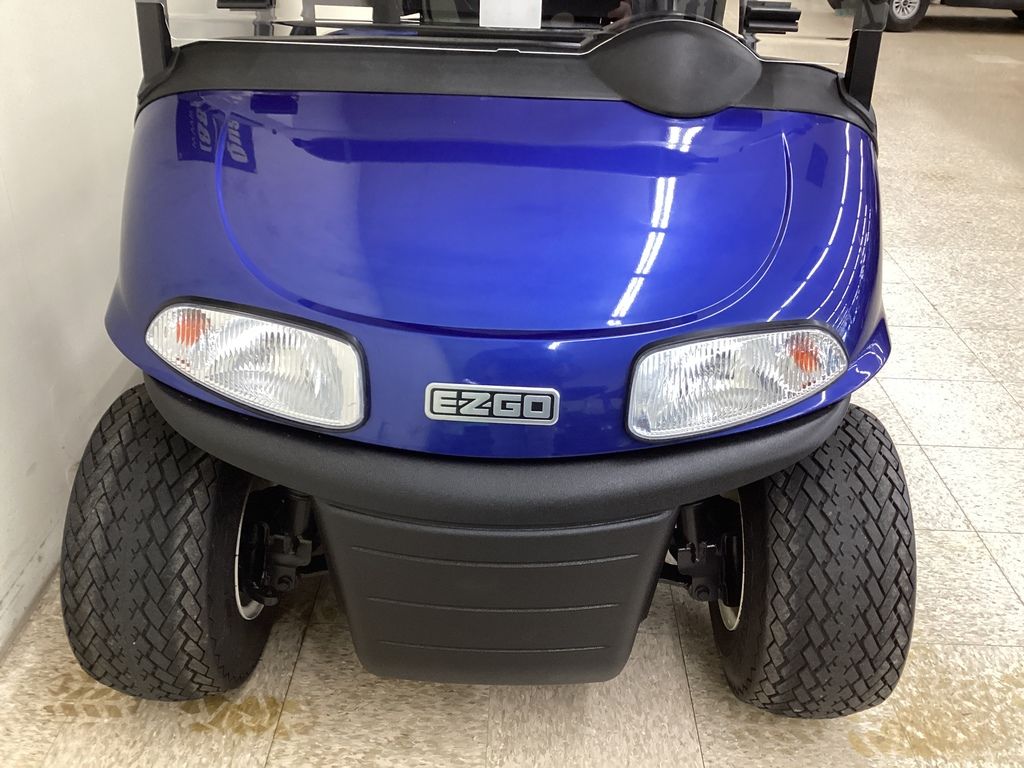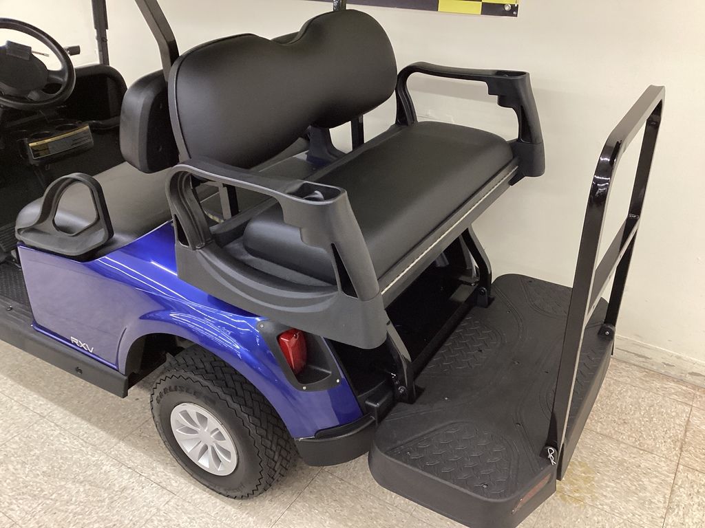 18 Months Warranty on Batteries – 6 Months Warranty on Cart – Electric Blue Body w/Long Black Top – Black Seats – NEW Executive Fold Down Backseat Kit w/Cooler Insert & Safety Bar – Deluxe Light Package w/Signals – Fold Down Windshield – 5 Panel Mirror – Stock EZ GO Wheels & Tires