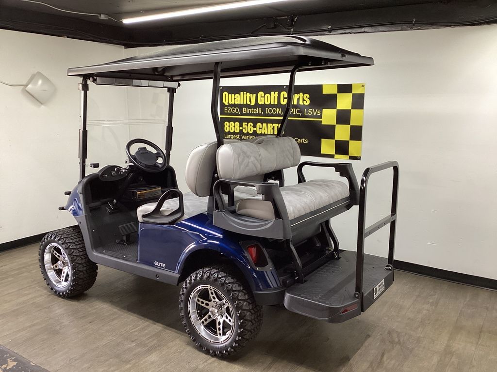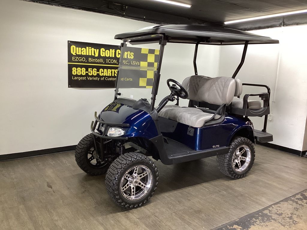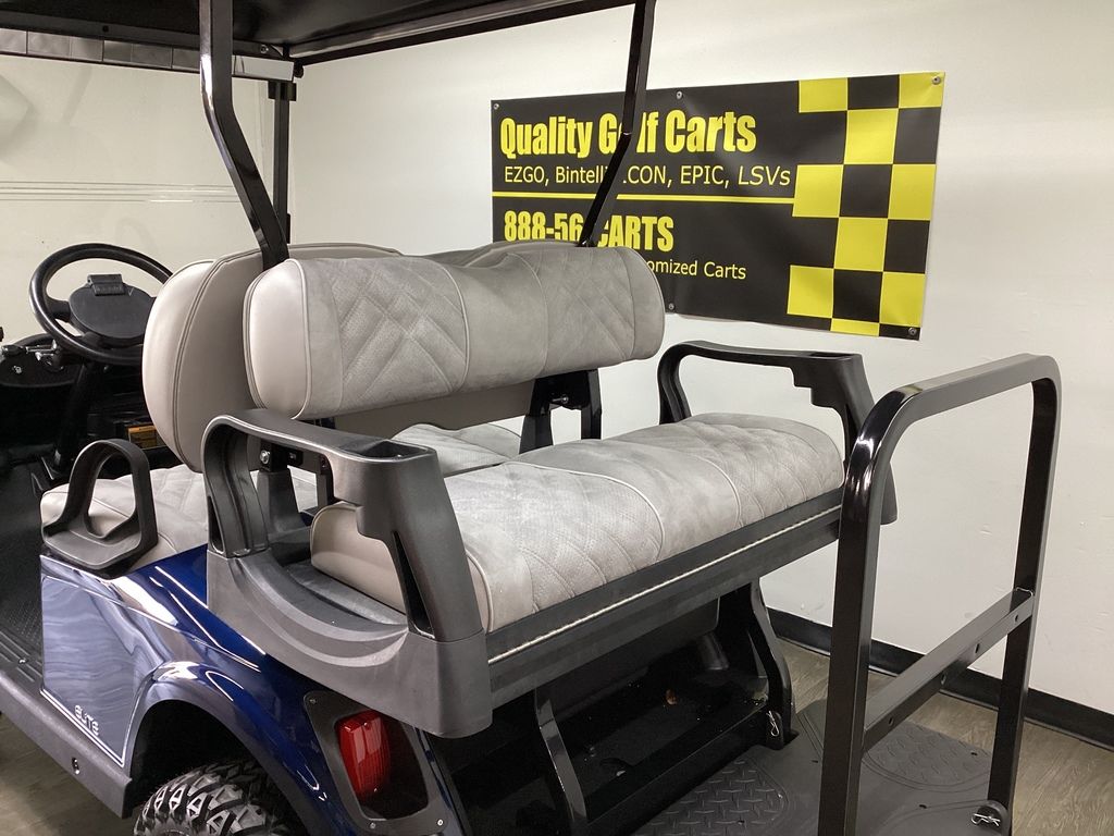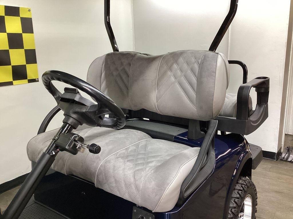 Lifted – NEW Patriot Blue Body w/ Long Top – NEW Pewter Suede Seats – NEW Executive Fold Down Rear Seat Kit w/ Cooler Insert – NEW Lift Kit w/ 14″ Sport Wheels & Tires – NEW LED Deluxe Light Package w/Signals – NEW EZ GO Lithium Battery – Ready To Go!