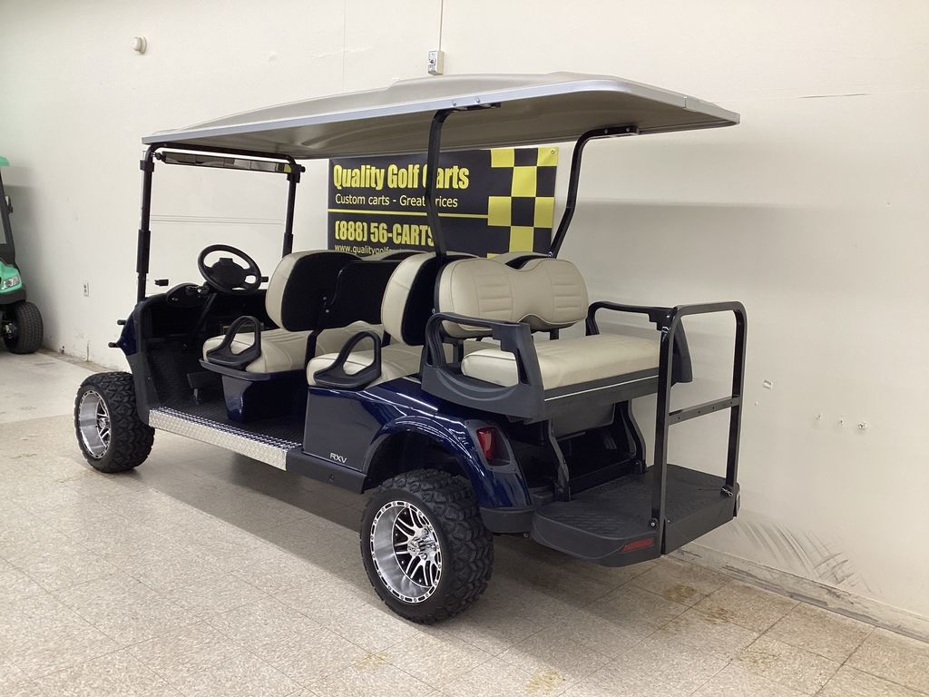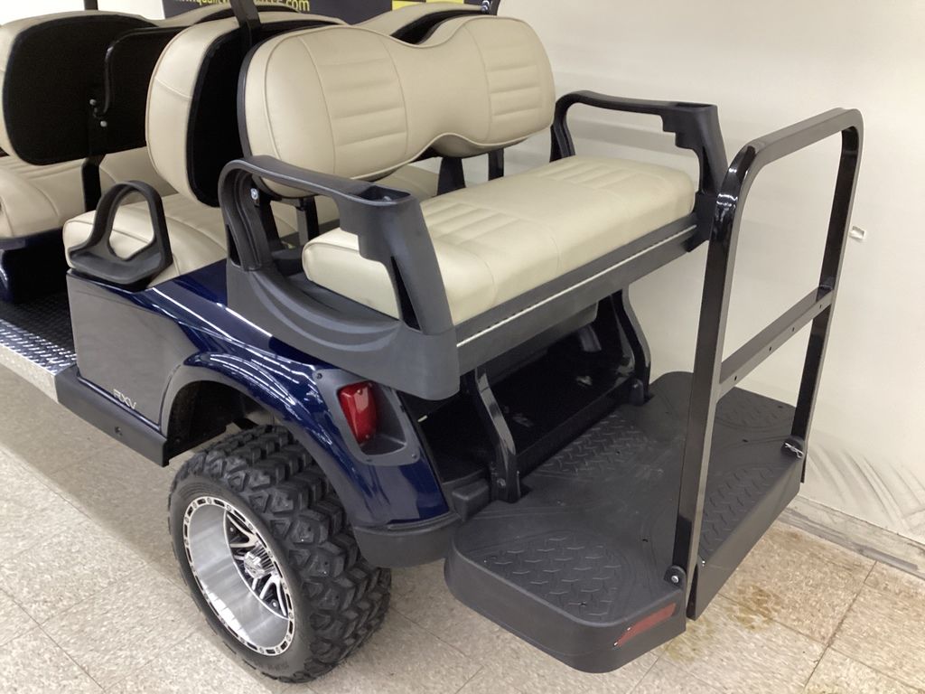 18 Months Warranty on Batteries – 12 Months Warranty on Cart – NEW Patriot Blue Body w/Long Stone Top – NEW Upgraded EZ GO Seats – NEW Executive Backseat Kit w/Cooler Insert & Safety Bar – NEW LED Deluxe Light Package w/Signals – NEW Lift Kit w/14″ Sport Wheels & Tires – NEW Fold Down Windshield – NEW Black Brush Guard – NEW 5 Panel Mirror – NEW SOC Meter