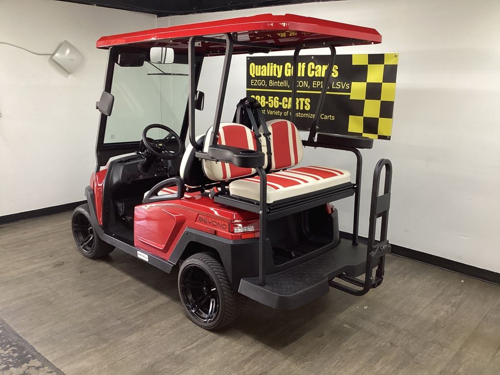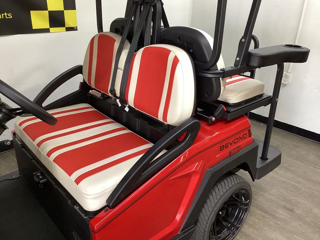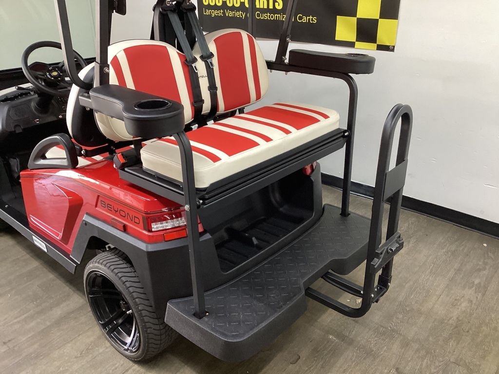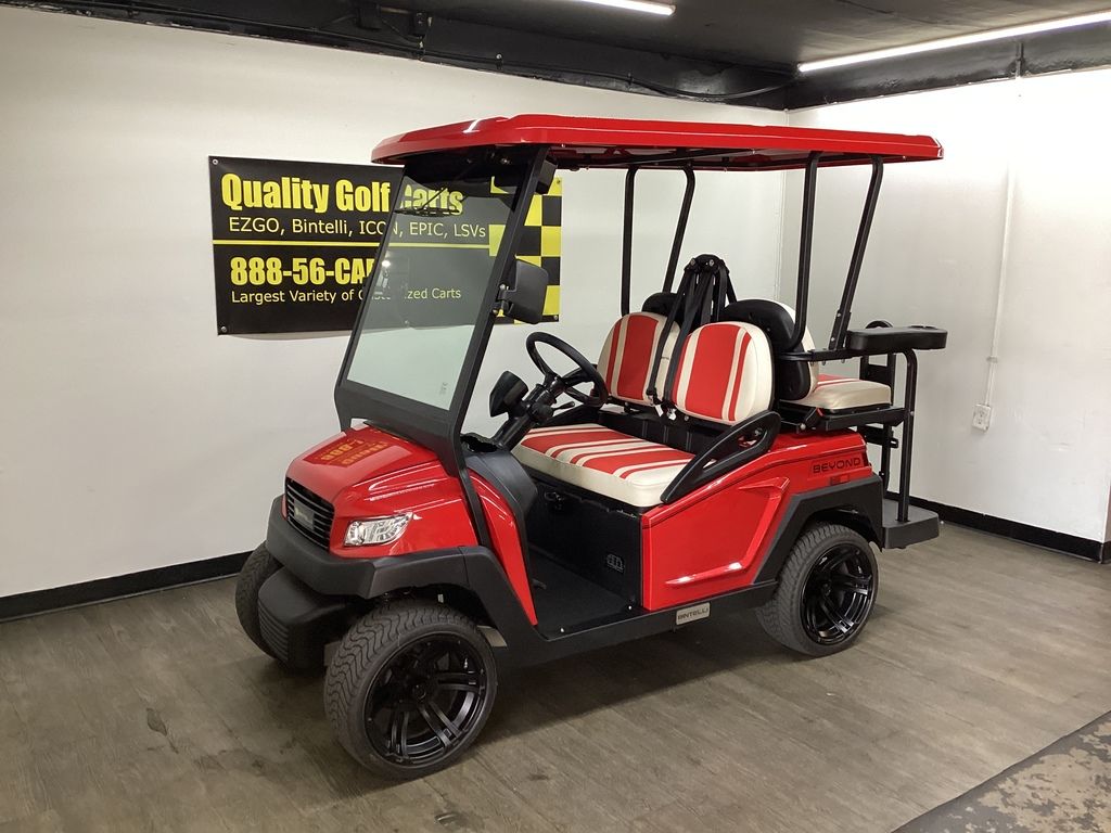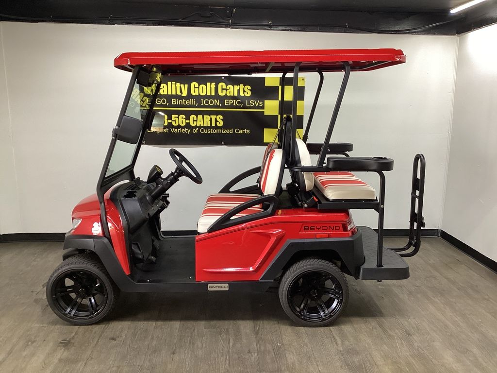 This Bintelli Beyond 4PR street legal golf cart is the newest addition to the Bintelli fleet and it is FULLY loaded! Complete with an aluminum frame, aluminum roof supports, AC motor, LED lighting, 14? wheels, a Bluetooth sound system, reverse camera, hydraulic disc brakes, two-tone premium seats, on-board smart charger, dual USB plugs, extended roof, rear flip seat, head lights, tail lights, turn signals, DOT windshield with wiper, DOT tires, DOT 3-point seat belts, and a 17 digit vin number.