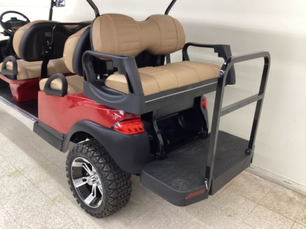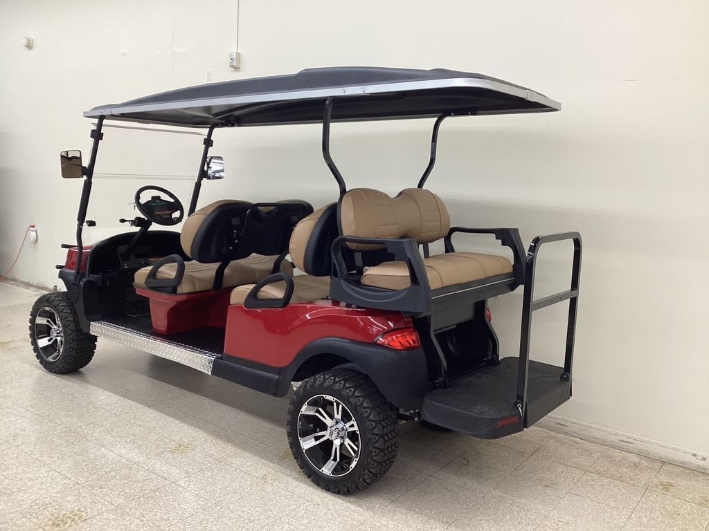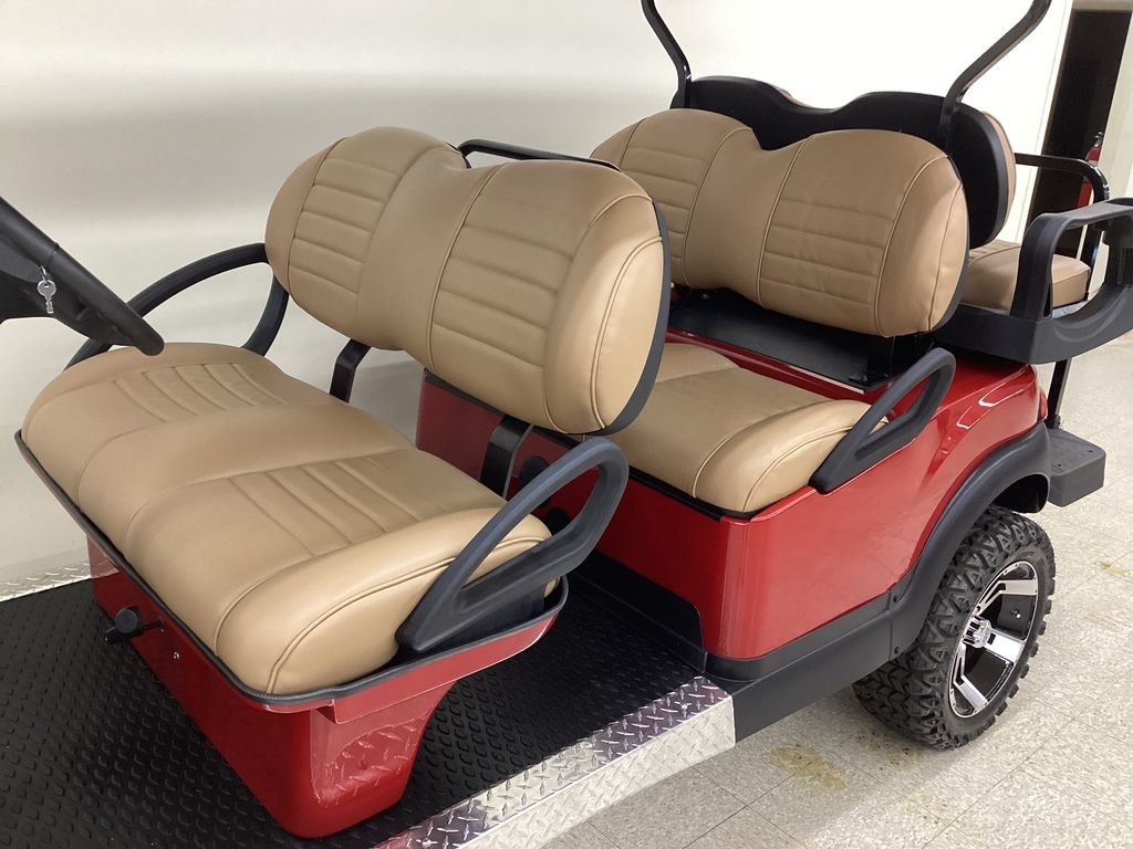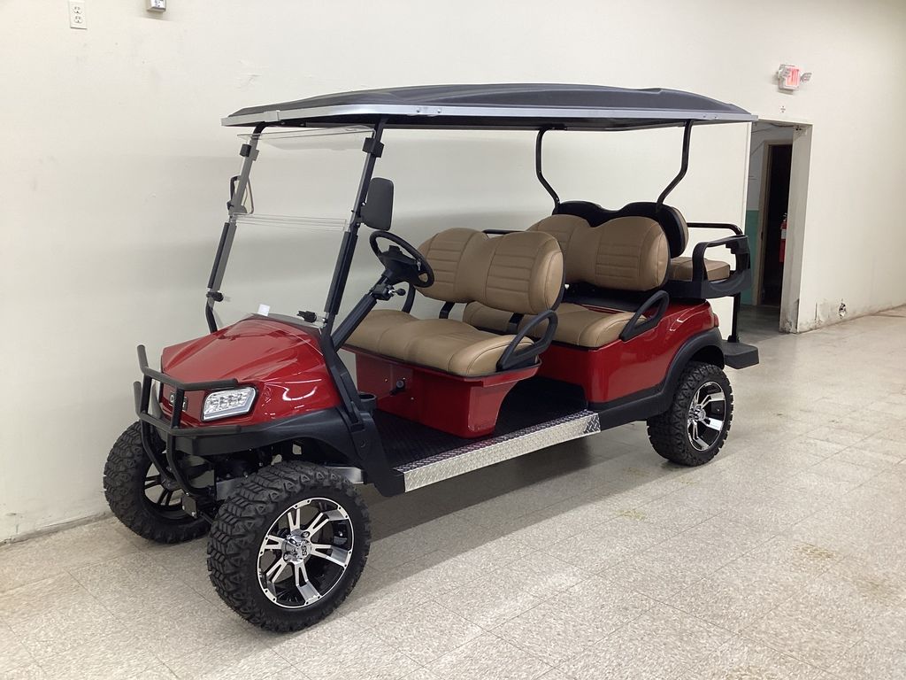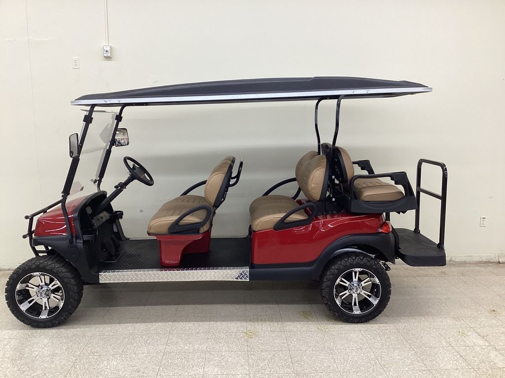 6 Months Warranty on Cart – Red Body w/Long Black Top – Upgraded Club Car Seats – NEW Executive Fold Down Rear Seat Kit w/Cooler Insert – NEW Lift Kit w/14″ Sport Wheels & Tires – NEW LED Deluxe Light Package w/Signals – Fold Down Windshield – Side Mirrors – Black Brush Guard – Fuel Injection – Serviced – Ready To Go!