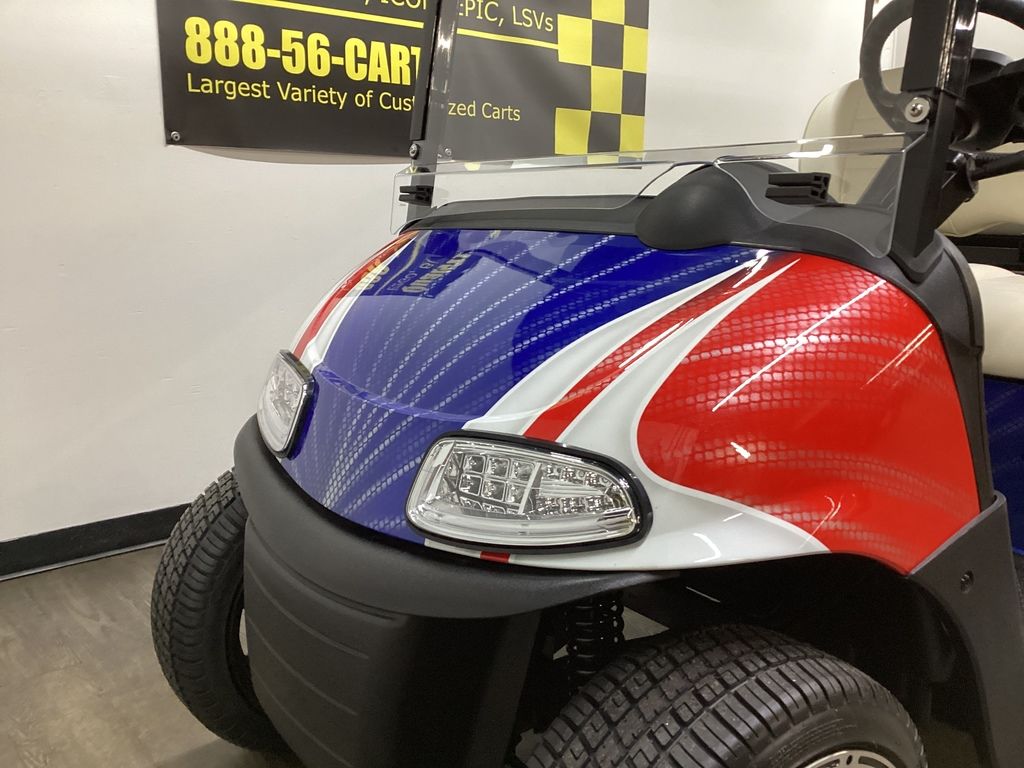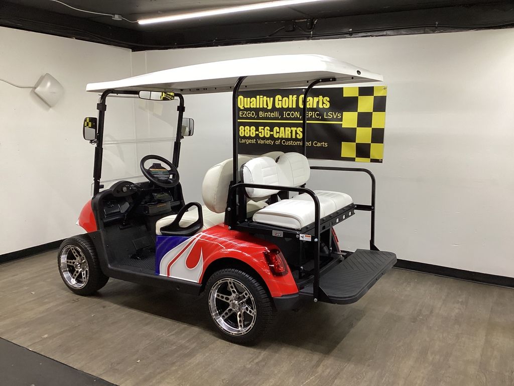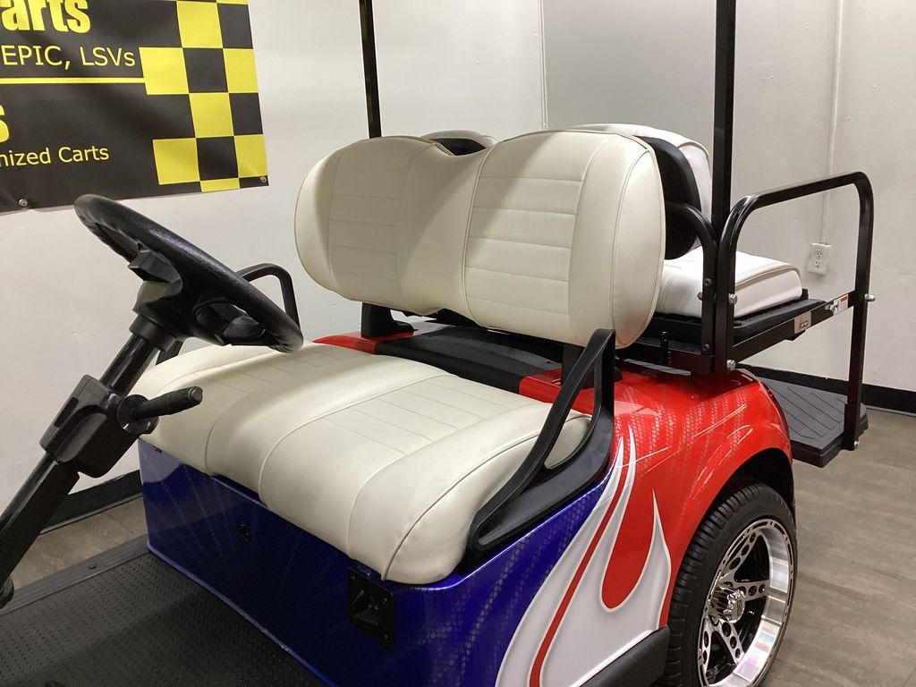 4 Years Warranty on Battery – 12 Months Warranty on Cart – NEW Custom Blue, White & Red Swirl Body w/Long White Top – Upgraded White EZ GO Seats – NEW Fold Down Rear Seat Kit – NEW LED Deluxe Light Package w/Signals – NEW CF Dash Pockets – NEW 14” Sport Wheels & Tires – NEW Fold Down Windshield – NEW Lighted Side Mirrors – NEW State of Charge Meter