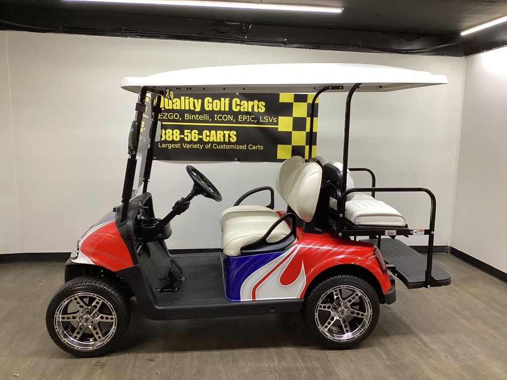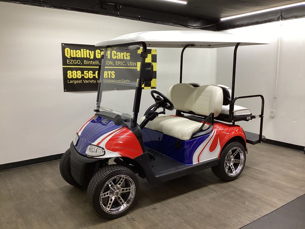 Non-Lifted – NEW Custom Blue, White & Red Swirl Body – Upgraded White EZ GO Seats – NEW LED Deluxe Light Package w/Signals – NEW 14″ Sport Wheels & Tires – EZ GO Lithium Battery – Ready To Go!!!