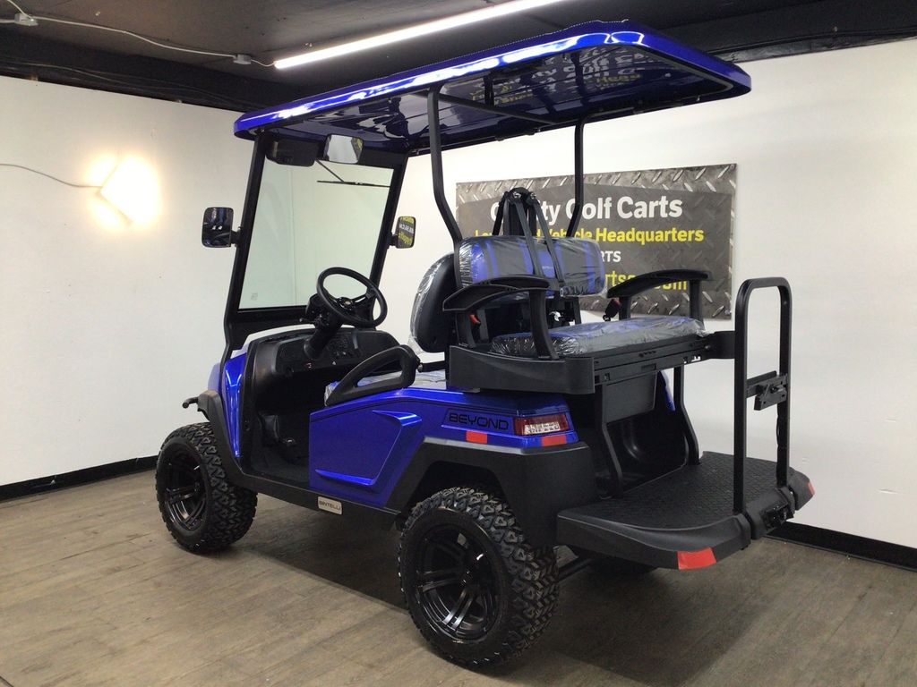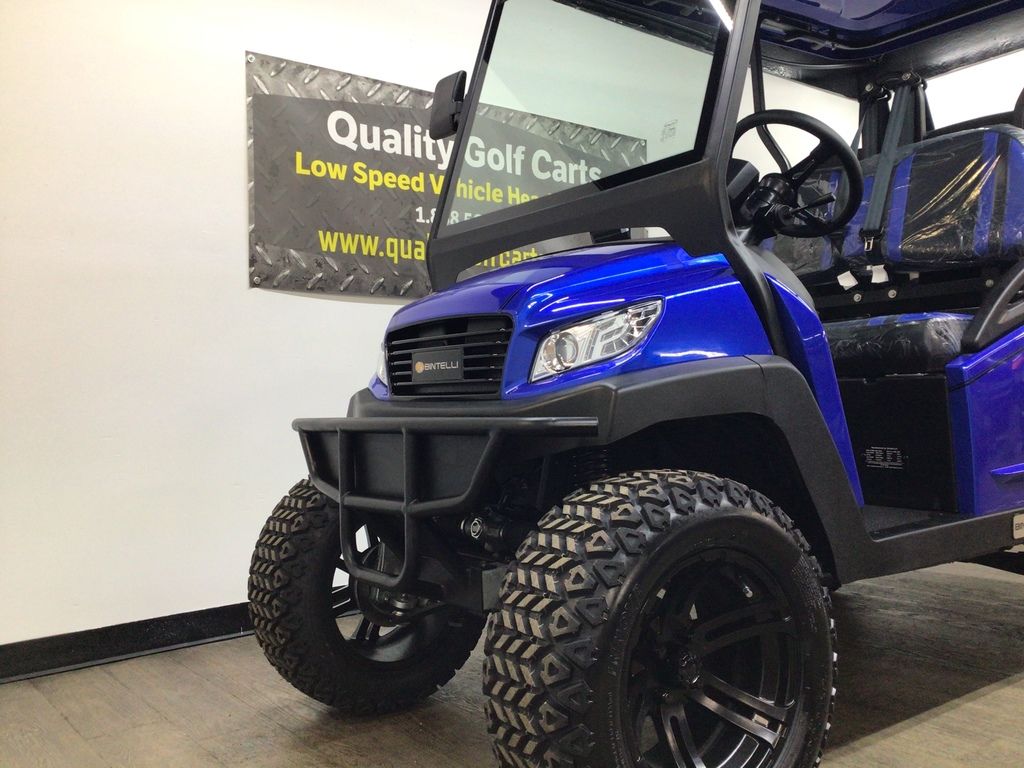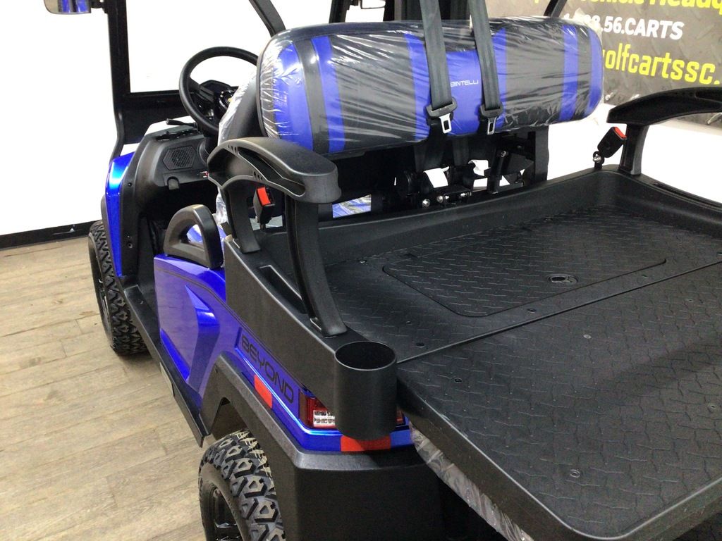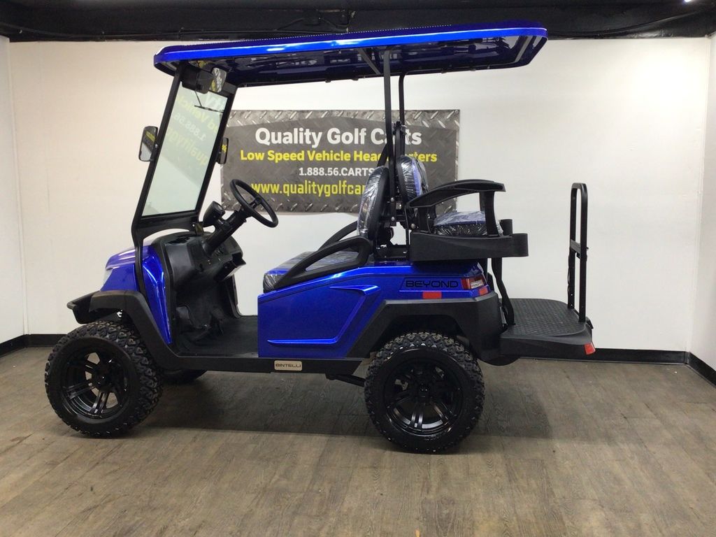 This Bintelli Beyond Lifted 4PR street legal golf cart is the newest addition to the Bintelli fleet and it is FULLY loaded! Complete with an aluminum frame, aluminum roof supports, AC motor, LED lighting, 23? tires, a Bluetooth sound system, reverse camera, hydraulic disc brakes, two-tone premium seats, on-board smart charger, dual USB plugs, extended roof, rear flip seat, head lights, tail lights, turn signals, DOT windshield with wiper, DOT tires, DOT 3-point seat belts, and a 17 digit vin number.