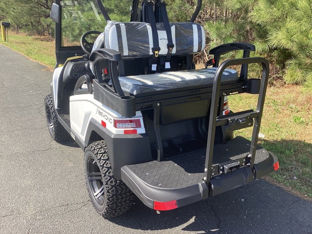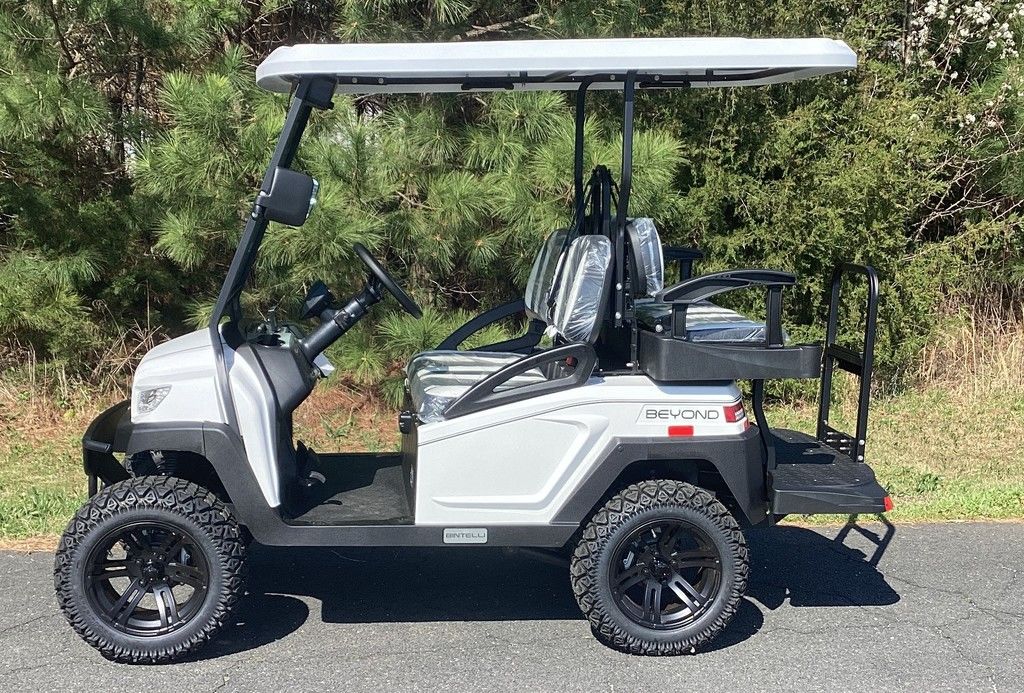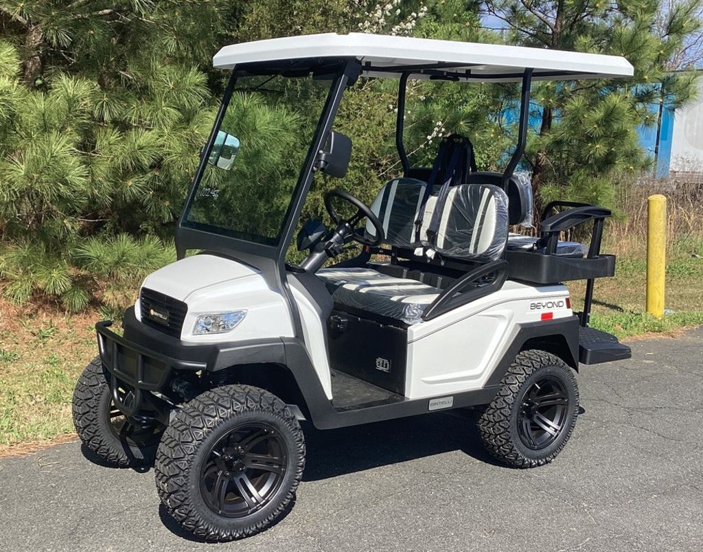 This Bintelli Beyond Lifted 6PR street legal golf cart is the newest addition to the Bintelli fleet and it is FULLY loaded! Complete with an aluminum frame, aluminum roof supports, AC motor, LED lighting, 22? tires, a Bluetooth sound system, reverse camera, hydraulic disc brakes, two-tone premium seats, on-board smart charger, dual USB plugs, extended roof, rear flip seat, head lights, tail lights, turn signals, DOT windshield with wiper, DOT tires, DOT 3-point seat belts, and a 17 digit vin number.