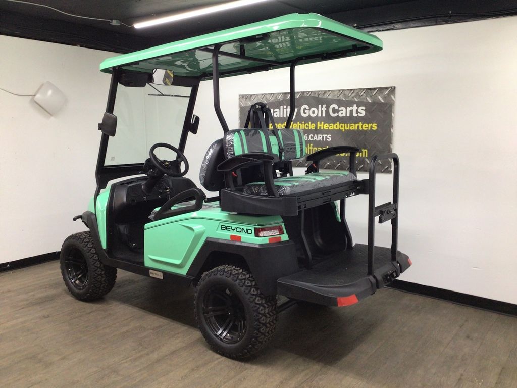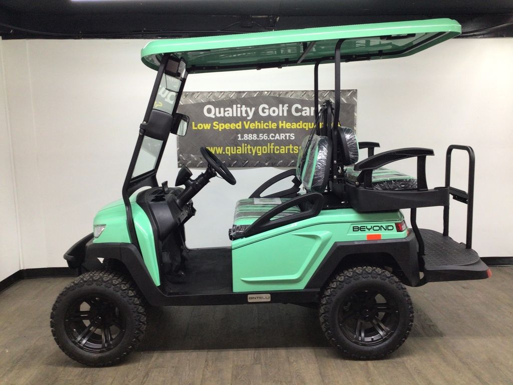 This Bintelli Beyond Lifted 4PR street legal golf cart is the newest addition to the Bintelli fleet and it is FULLY loaded! Complete with an aluminum frame, aluminum roof supports, AC motor, LED lighting, 23? tires, a Bluetooth sound system, reverse camera, hydraulic disc brakes, two-tone premium seats, on-board smart charger, dual USB plugs, extended roof, rear flip seat, head lights, tail lights, turn signals, DOT windshield with wiper, DOT tires, DOT 3-point seat belts, and a 17 digit vin number.